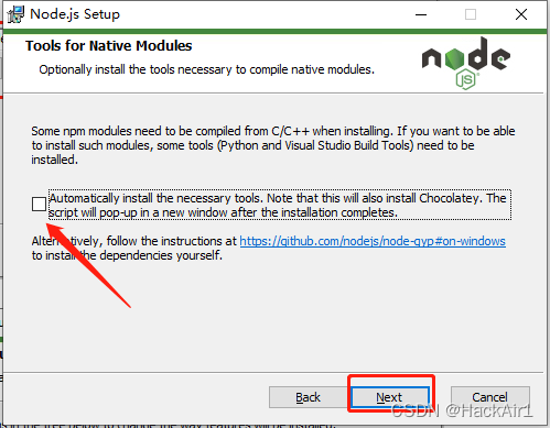 这里选项是:自动安装必要的工具。注意,这也将安装Chocolatey。安装完毕后脚本会弹出一个新得窗口中,这里我没有勾选。而是直接下一步。