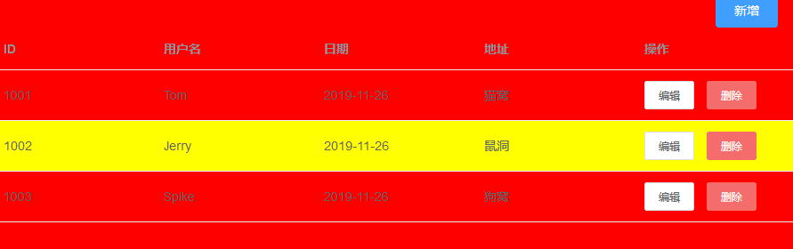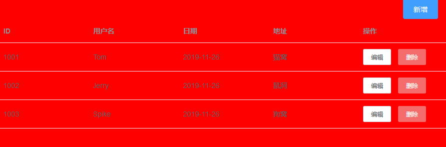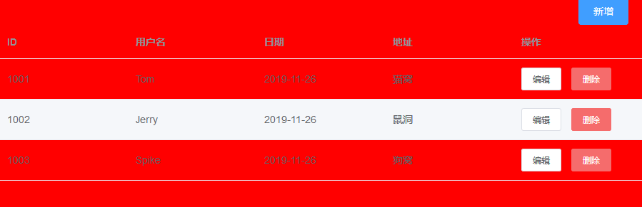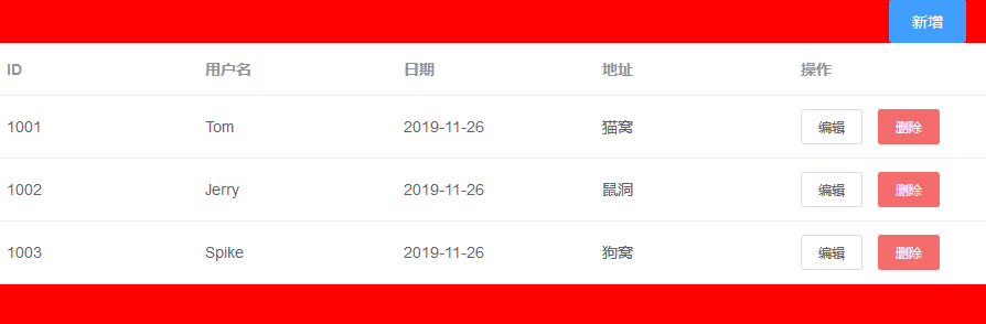 这里我们会发现我们将div的颜色设置为红色,而el-table默认的背景颜色为白色的。所以下面我们要来修改他的背景颜色。