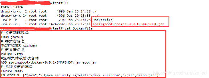 在linux中创建一个文件:Dockerfile ,并价格springboot项目的jar包与此文件放到同一个问价夹中。