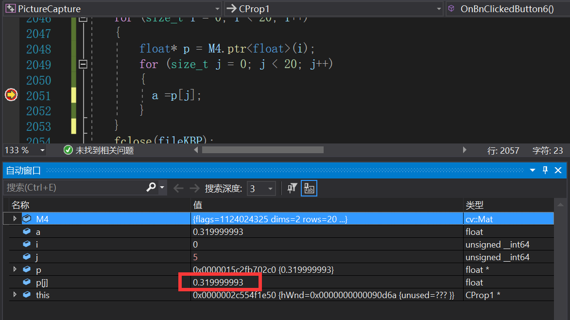 {// TODO: 在此添加控件通知处理程序代码/******************************打开对话框*************************************/CString fileName = L"";BOOL bOpenFileDialog = TRUE;//格式:过滤器描述符(显示作用)+   + 文件扩展名称(过滤作用)//多个扩展名称之间用(;)分隔,两个过滤字符串之间以 分隔//最后的过滤器需要以两个  结尾TCHAR BASED_CODE szFilter[] = _T("二进制文件(*.dat)|*.dat|");//bOpenFileDialog   TRUE则显示打开文件对话框,FALSE则显示保存文件对话框。//lpszDefExt         指定默认的文件扩展名。//lpszFileName       指定默认的文件名。//dwFlags            指明一些特定风格。//lpszFilter         是最重要的一个参数,它指明可供选择的文件类型和相应的扩展名。//pParentWnd         为父窗口指针。CFileDialog fileDlg(bOpenFileDialog, _T("dat"), fileName,OFN_HIDEREADONLY | OFN_OVERWRITEPROMPT, szFilter, this);CString strFilePath;// 显示打开文件对话框   if (IDOK == fileDlg.DoModal()){//取文件名全称,包括完整路径。strFilePath = fileDlg.GetPathName();}//CString-->const char*const char* fileKB;char temp[100];::wsprintfA(temp, "%ls", (LPCTSTR)strFilePath);fileKB = temp;MessageBox(CString(fileKB));//打开文件FILE* fileKBP = fopen(fileKB, "rb");if (fileKBP == NULL){CFileException ex;TCHAR szError[1024];ex.GetErrorMessage(szError, 1024);MessageBox(szError);return;}Mat M4 = Mat(20, 20, CV_32FC1);float* p = M4.ptr();//写float型数据到MAT中fread(p, sizeof(float), M4.cols*M4.rows, fileKBP);float a = 0;for (size_t i = 0; i < 20; i++){float* p = M4.ptr(i);for (size_t j = 0; j < 20; j++){a =p[j];}}fclose(fileKBP);