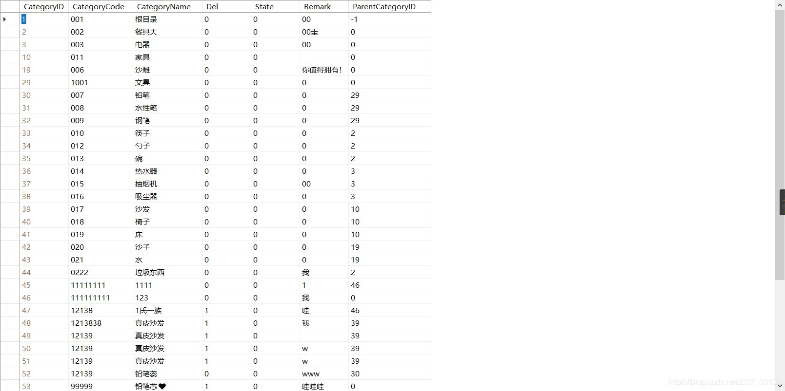 需要用到的字段是:CategoryID(列ID)、CategoryName(分类名)、ParentCategoryID(父类ID)