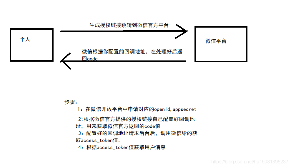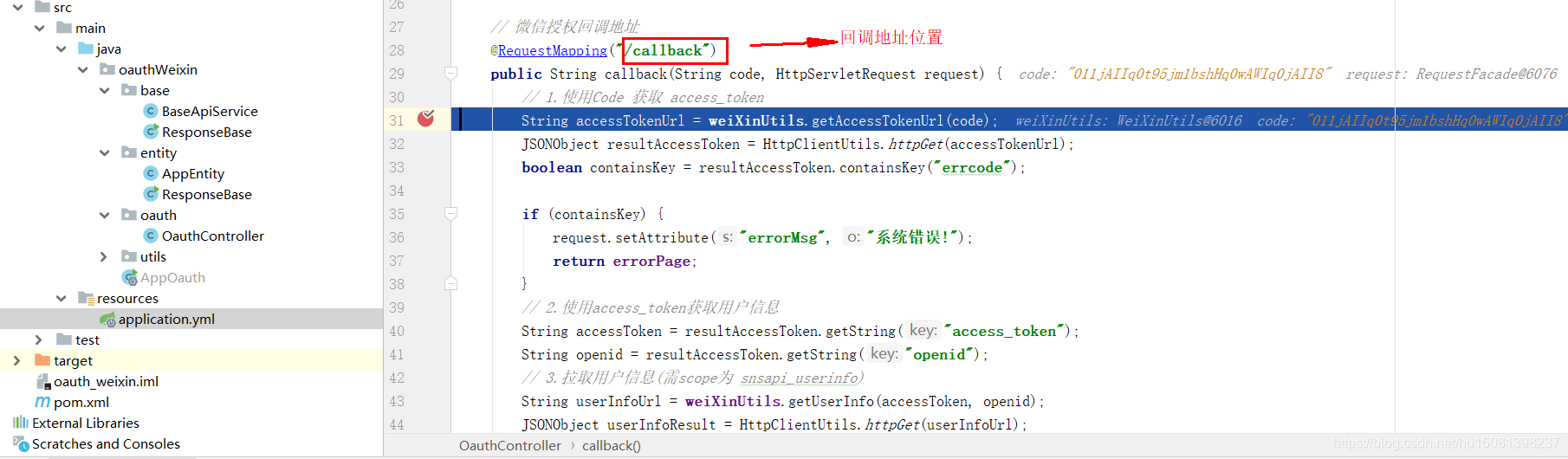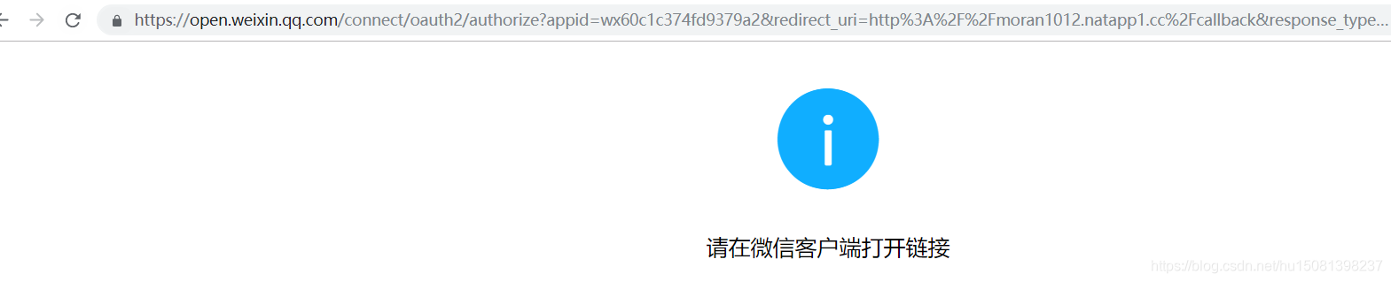 public class OauthController extends BaseApiService {@Autowiredprivate WeiXinUtils weiXinUtils;private String errorPage = "errorPage";// 生成授权链接@RequestMapping("/authorizedUrl")public String authorizedUrl() {return "redirect:" + weiXinUtils.getAuthorizedUrl();}// 微信授权回调地址@RequestMapping("/callback")public String callback(String code, HttpServletRequest request) {// 1.使用Code 获取 access_tokenString accessTokenUrl = weiXinUtils.getAccessTokenUrl(code);JSONObject resultAccessToken = HttpClientUtils.httpGet(accessTokenUrl);boolean containsKey = resultAccessToken.containsKey("errcode");if (containsKey) {request.setAttribute("errorMsg", "系统错误!");return errorPage;}// 2.使用access_token获取用户信息String accessToken = resultAccessToken.getString("access_token");String openid = resultAccessToken.getString("openid");// 3.拉取用户信息(需scope为 snsapi_userinfo)String userInfoUrl = weiXinUtils.getUserInfo(accessToken, openid);JSONObject userInfoResult = HttpClientUtils.httpGet(userInfoUrl);System.out.println("userInfoResult:" + userInfoResult);request.setAttribute("nickname", userInfoResult.getString("nickname"));request.setAttribute("city", userInfoResult.getString("city"));request.setAttribute("headimgurl", userInfoResult.getString("headimgurl"));return "info";}}
