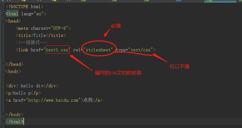 步骤三:在html文档中的head标签中的link标签 href="css文档链接" rel="stylesheet"