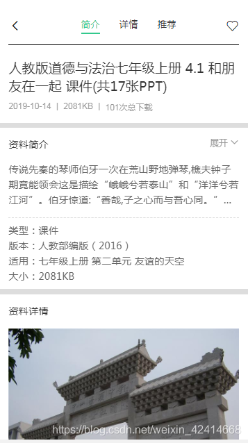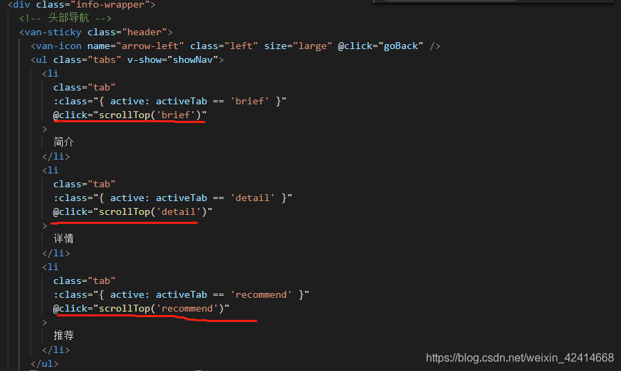 1)点击“简介”、“详情”、“推荐”时,页面滚动到相对应的位置