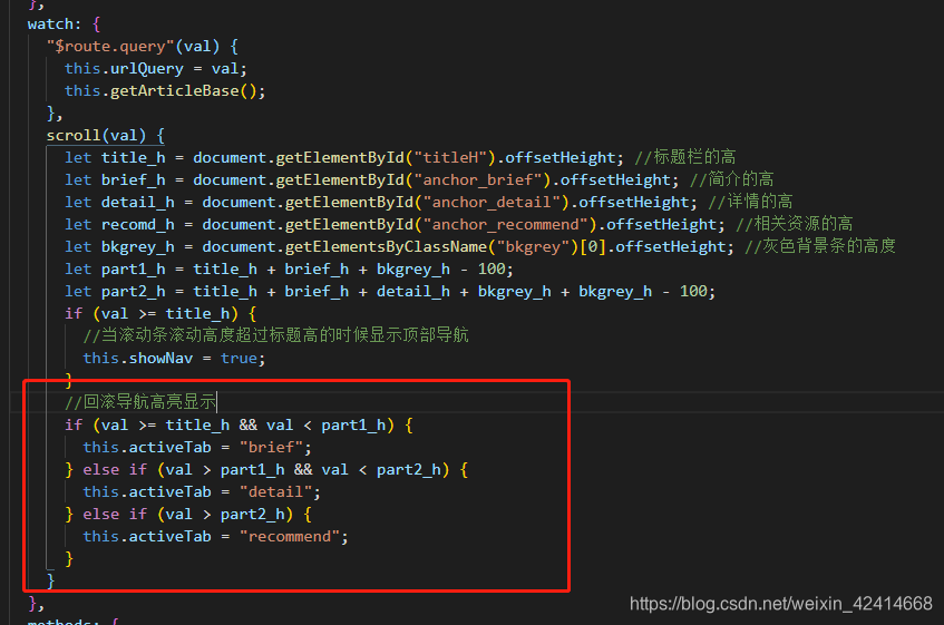 在vue中需要watch这个scroll变量,根据当前滚动条的的位置来判断当前处于什么位置: