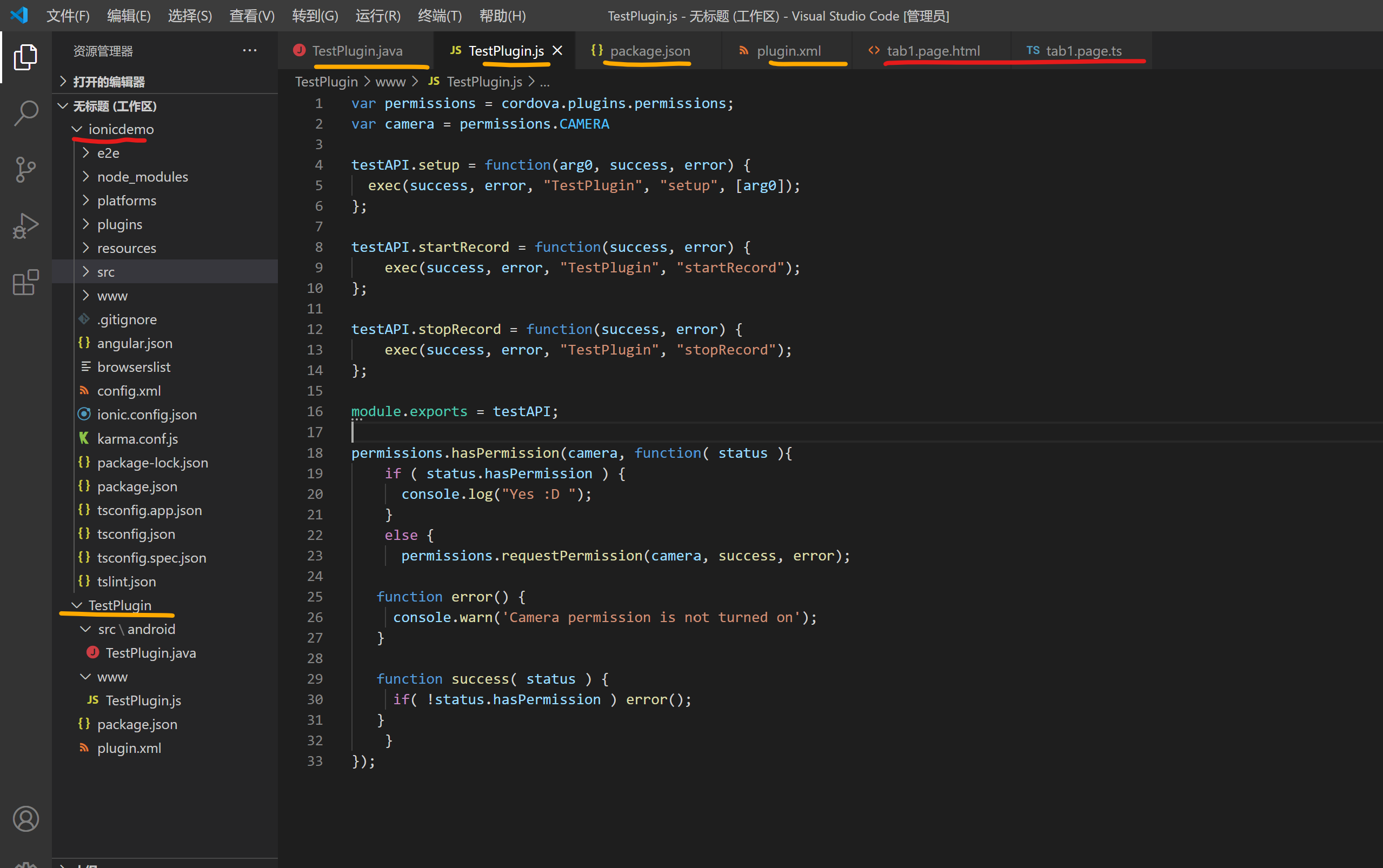 把ionicdemo文件夹和TestPlugin文件夹放到VS code同一个工作区内,方便编辑: