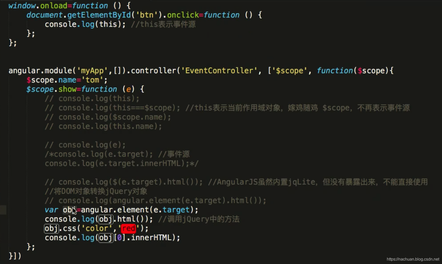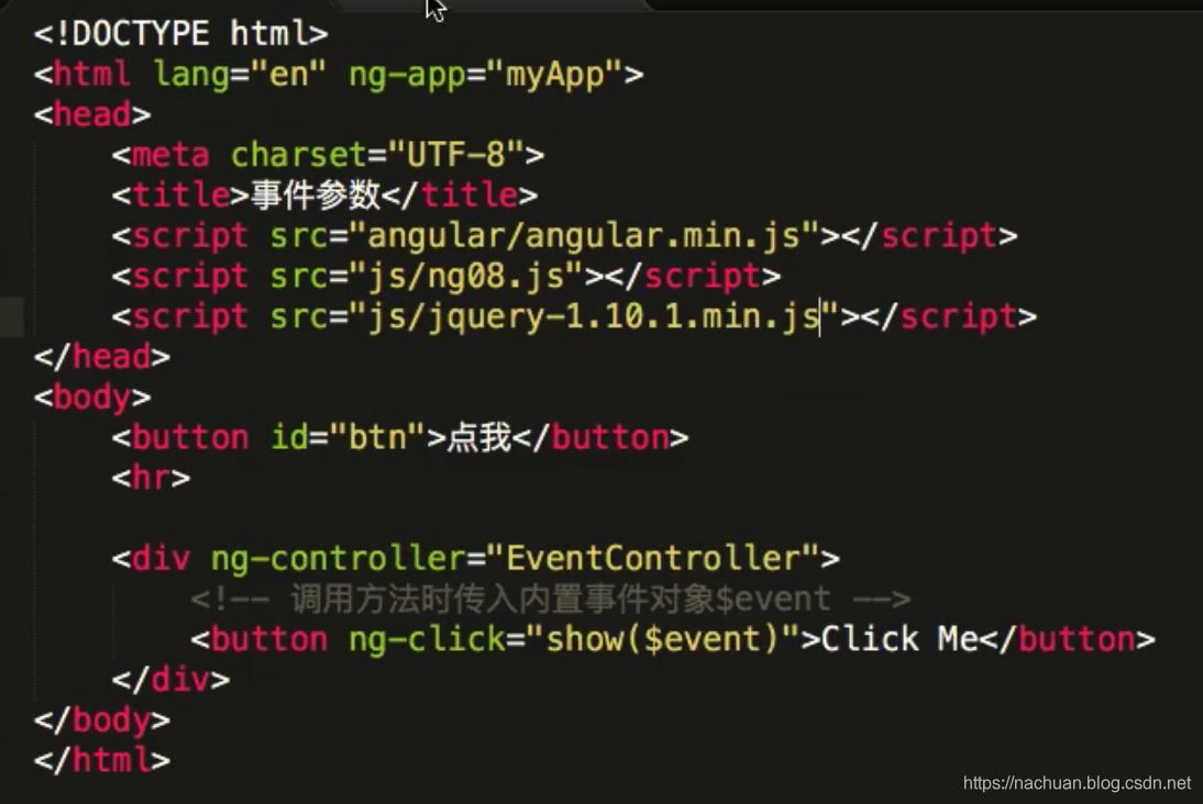 事件参数:(绑定方法)target事件源,内置事件对象:$event