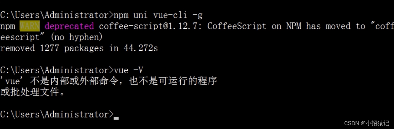 卸载vue-cli2命令:npm uninstall vue-cli -g