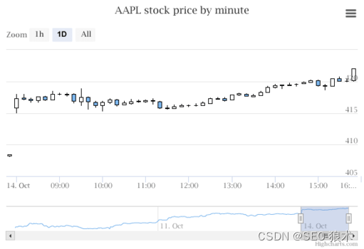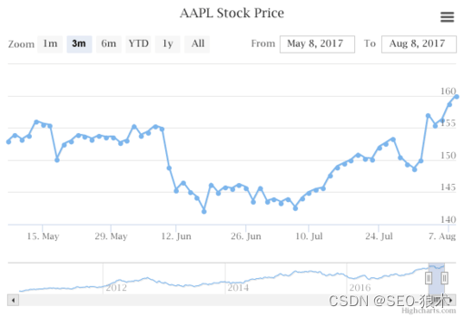 在导航大型数据集(可能是几年内的每小时值)时,图表库需要提供一种查看特定时间范围的快速方法。Highstock 提供了一个范围选择器,用户可以在其中放大预选的时间范围,如 1m、1y 或 YTD,或手动添加日期范围。