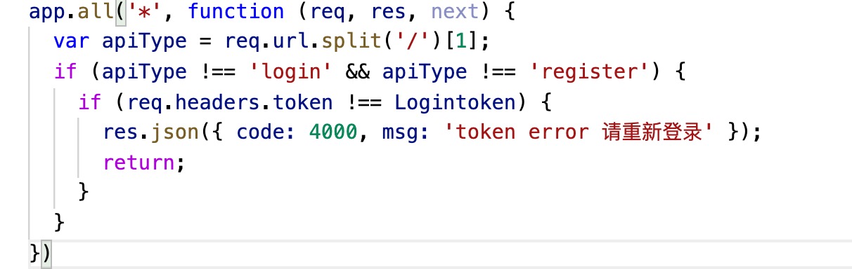 后端express 写入全局方法拦截除了注册、登录以外的所有接口