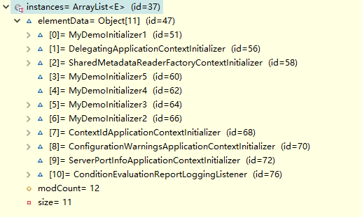 启动程序,AnnotationAwareOrderComparator.sort执行后,我们可以看到结果。MyDemoInitializer1因为实现了PriorityOrdered接口,所有排第一。DelegatingApplicationContextInitializer、SharedMetadataReaderFactoryContextInitializer也实现了Ordered接口,order值是0,所以排2、3位。然后就是4个自定义的MyDemoInitializer,以此类推。