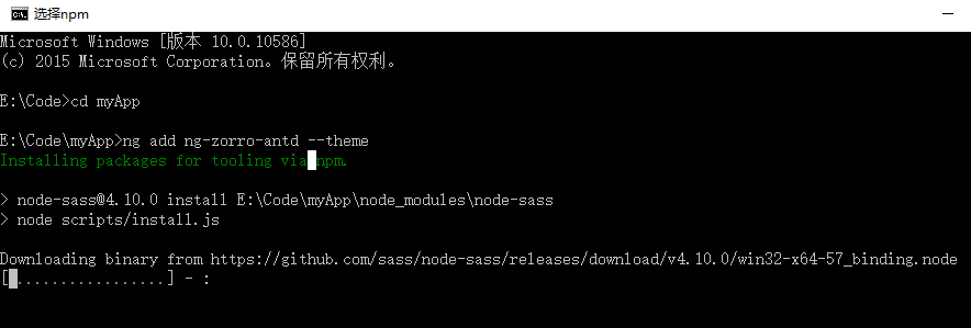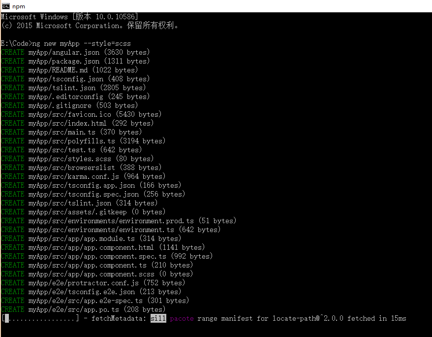 在自己的code目录下,进入cmd,输入命令 ng new myApp --style=scss
