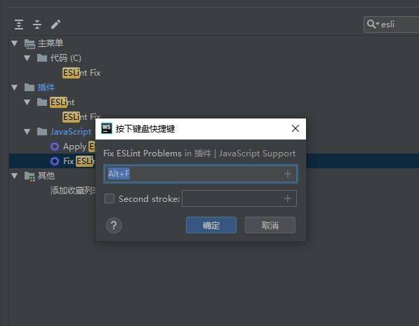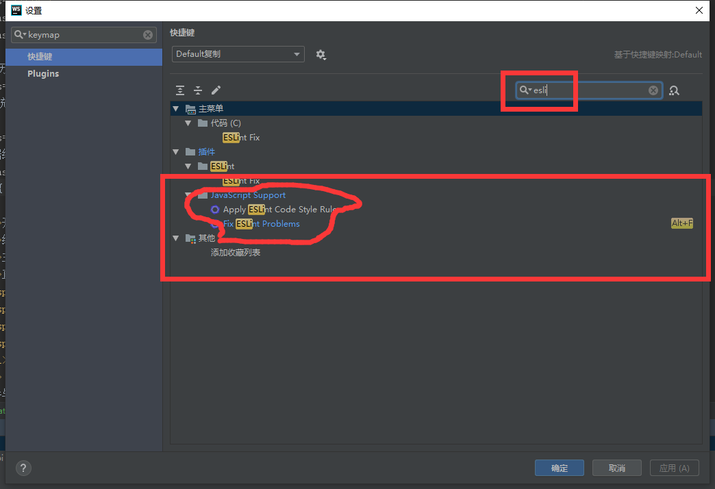 3、到这一步,实际规则已经配置好了,下来就是调用的问题了,搜索keymap,然后把右边的去掉,改成esli ,就可以看到 Fix ESLint Problems了,然后右键新增快捷键 Alt+F,