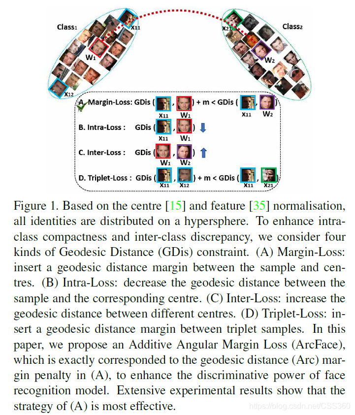 一个主要的挑战在特征学习,使用深度卷积神经网络(DCNNs)对大尺度人脸识别,是设计合适loss函数,它能够增强区别。中心损失距离在深度特征和他们相应的类中心在欧几里得空间去实现类内紧度。球体猜测这个线性转换矩阵在最后全卷积层,能够使用作为一个表示类中在欧几里得空间,因此惩罚角在深度特征和他们对应权重使用一个惩罚方式。在这篇文章,我们提出了一个附加角边损失(ArcFace)来获得较高的区别特征来进行人脸识别。这个提出ArcFace有一个清楚的几何解释,由于它提取对应测地距离在一个超空间。我们展示可论证地最广泛的实验评估所有当前先进的人脸识别方法在10个人脸识别基准,它包含一个新的大尺度图像数据集拥有万亿点对,一个大尺度视频数据集。我们展示ArcFace一致性能超前以及能够容易地实施,可以忽略计算开销。为进行将来研究,代码已经公布在:https://github.com/deepinsight/insightface