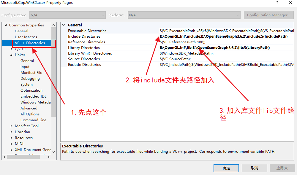 第三步:加入头文件include文件夹路径和库文件lib文件夹路径(注意这里是VC++ Directories选项,只需要配置include和lib文件夹路径)
