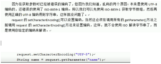 import java.io.IOException;public class test02 extends HttpServlet {/** post方式请求处理中文乱码* */@Overrideprotected void doPost(HttpServletRequest req, HttpServletResponse resp) throws ServletException, IOException {// 第二种方式  给request设置编码为:UTF-8(必须在getParameter之前使用)req.setCharacterEncoding("UTF-8");String name = req.getParameter("name");String introduce = req.getParameter("introduce");System.out.println(name);System.out.println(introduce);}