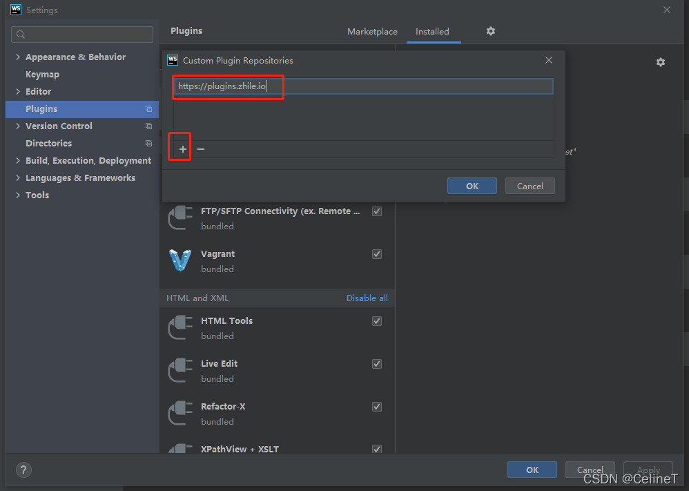 在出现的弹框中点击+,填写 https://plugins.zhile.io