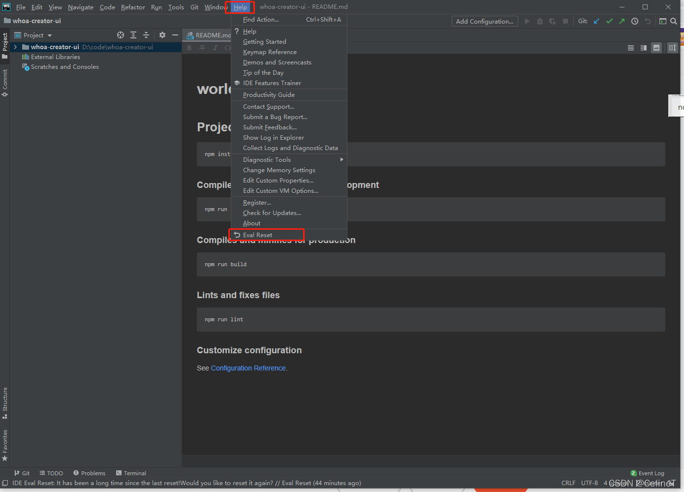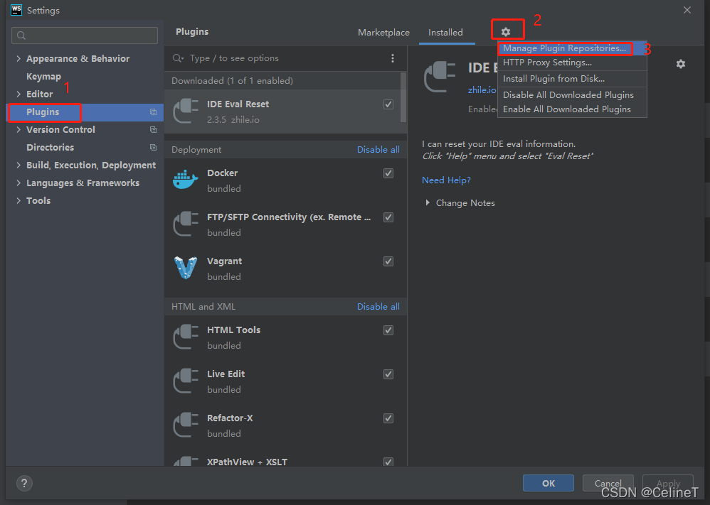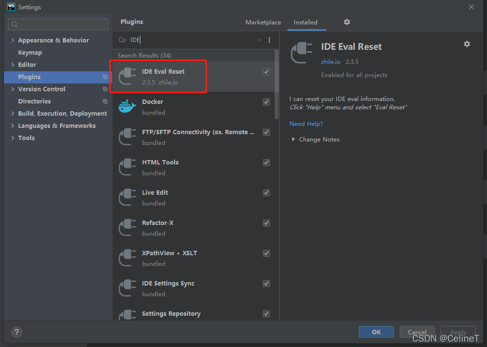 然后搜索IDE Eval Reset插件,如果搜索不到,可以重启一下webstorm