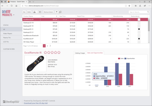 Office-Inspired - ASP.NET 网格、电子表格、功能区等。使用 DevExpress Web 控件,您可以在您熟悉和喜爱的平台上搭建通向未来的桥梁。DevExpress ASP.NET 订阅中附带的 110 多个控件经过精心设计,因此无论目标浏览器或计算设备如何,您都可以为 Web 提供功能性、优雅和交互式的体验。