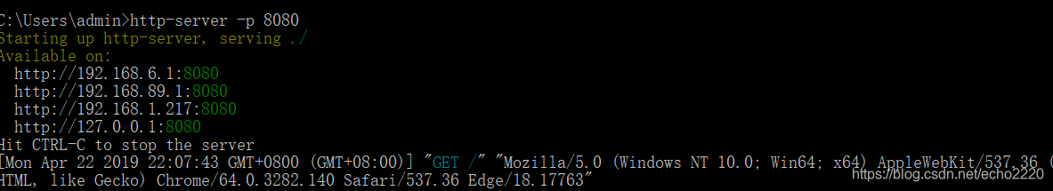 命令中-g参数会把http-server模块设置为全局的,这样就可以直接在命令行里直接使用http-server命令。完成此步后,可以通过下面的命令,在任意文件夹内启动一个服务器。