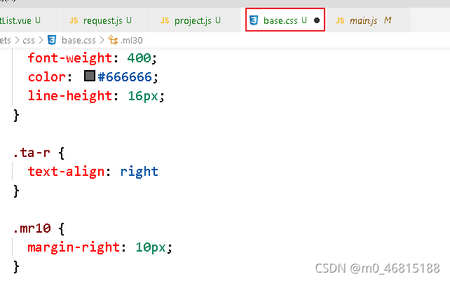 在项目开发中多个页面或者多个模块用到相同的样式,可以采取将这些相同的样式都放在一个css文件中,在main.js中引用即可,再在需要的.vue文件中使用即可