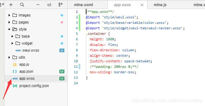 第二步:引入需要用到的样式文件到app.wxss中,或者在需要使用的页面引入也可以(第二行和第四行只需要一个,猜测weui.wxss是包含了所有组件样式代码)