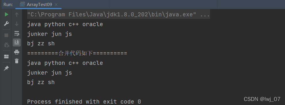 package com.bjpowernode.javase.array;public class ArrayTest09 {public static void main(String[] args) {// 二维数组String[][] array = {{"java", "python", "c++", "oracle"},{"junker", "jun", "js"},{"bj", "zz", "sh"}};// for循环遍历for (int i = 0; i < array.length; i++) { // 对二维数组当中的一维数组进行循环遍历String[] a = array[i]; // 拿到二维数组当中的一维数组for (int j = 0; j < a.length; j++) { // 对一维数组里面的元素进行循环遍历System.out.print(a[j] + " "); // 不换行、+“ ”让java python中间隔开}// 输出换行符System.out.println(); // 换行 [当一个一维数组里面的元素全循环后进行一次换行]// 不换行的话全输出在同一直线上了}System.out.println("=========合并代码如下==========");// 合并代码// for循环遍历for (int i = 0; i < array.length; i++) { // 对二维数组当中的一维数组进行循环遍历for (int j = 0; j < array[i].length; j++) { // 对一维数组里面的元素进行循环遍历System.out.print(array[i][j] + " "); // 不换行、+“ ”让java python中间隔开}// 输出换行符System.out.println(); // 换行 [当一个一维数组里面的元素全循环后进行一次换行]// 不换行的话全输出在同一直线上了}}