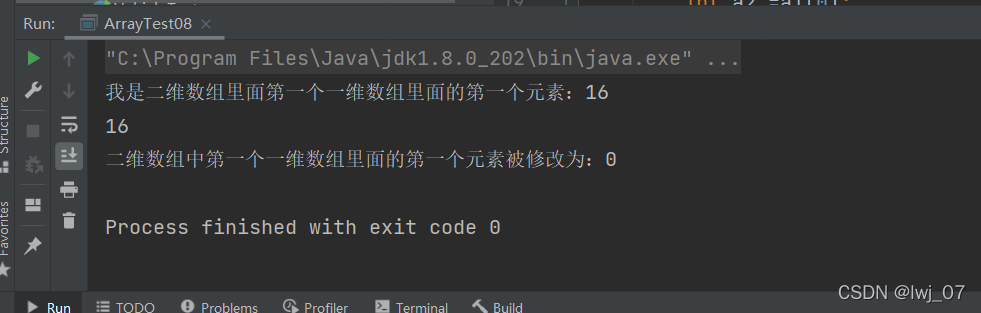 public class ArrayTest08 {public static void main(String[] args) {// 二维数组int[][] a ={ {16,9,3,6}, {9,7,3,90}, {6,76,10} };// 请取出以上二维数中的第一个一维数组int[] a1 =a[0]; // 二维数组中第一个一维数组// 再取出第一个一维数组里面的第一个元素int a2 =a1[0];System.out.println("我是二维数组里面第一个一维数组里面的第一个元素:"+a2); // 16// 以上代码合并System.out.println(a[0][0]); // 16// 改a[0][0] =0;System.out.println("二维数组中第一个一维数组里面的第一个元素被修改为:"+a[0][0]); // 0}
