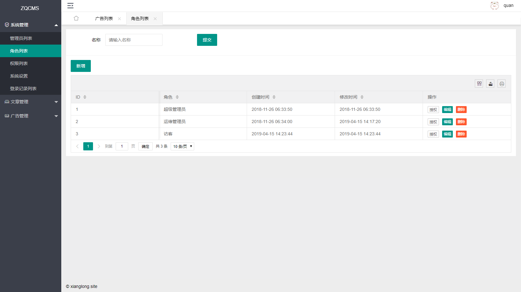 基于laravel+layui开发完整cms后台,系统主要是志在更快的开发后台,减少代码冗余,所以本cms基本大部分通过js渲染html,php代码均为模块化写法,使用了模块化的开发模式