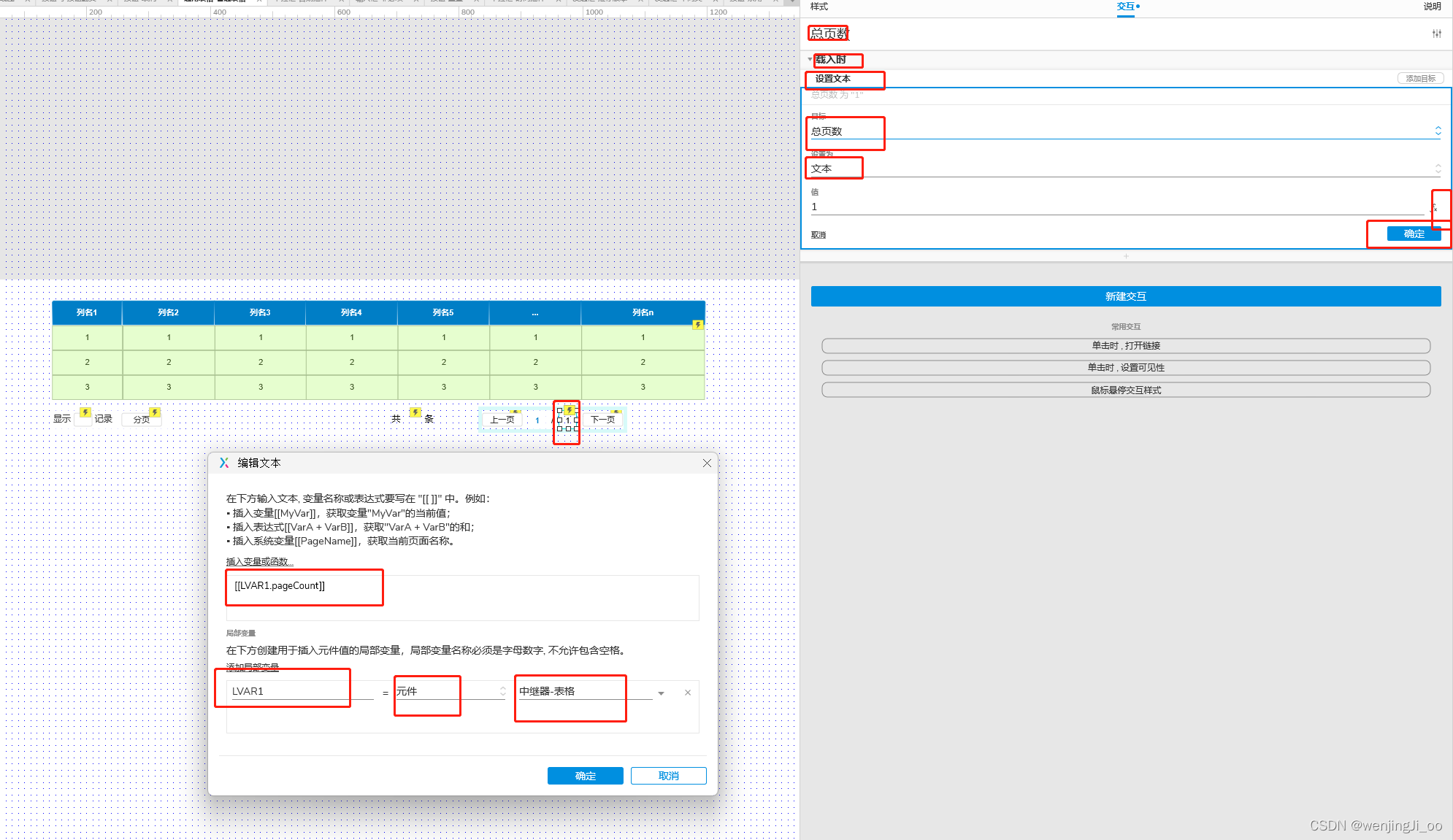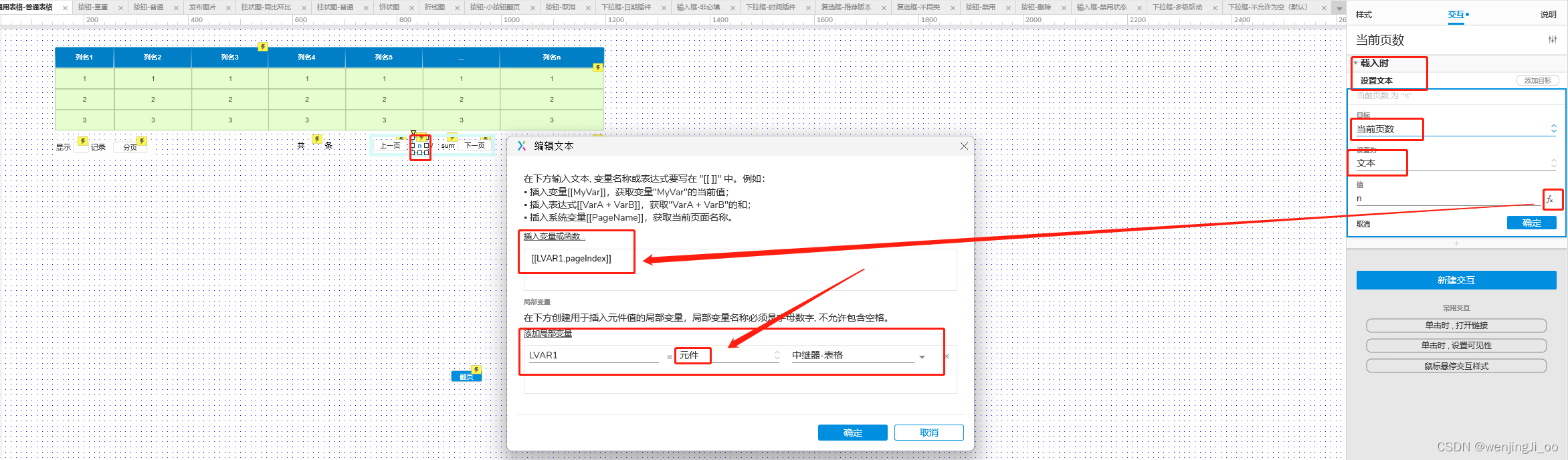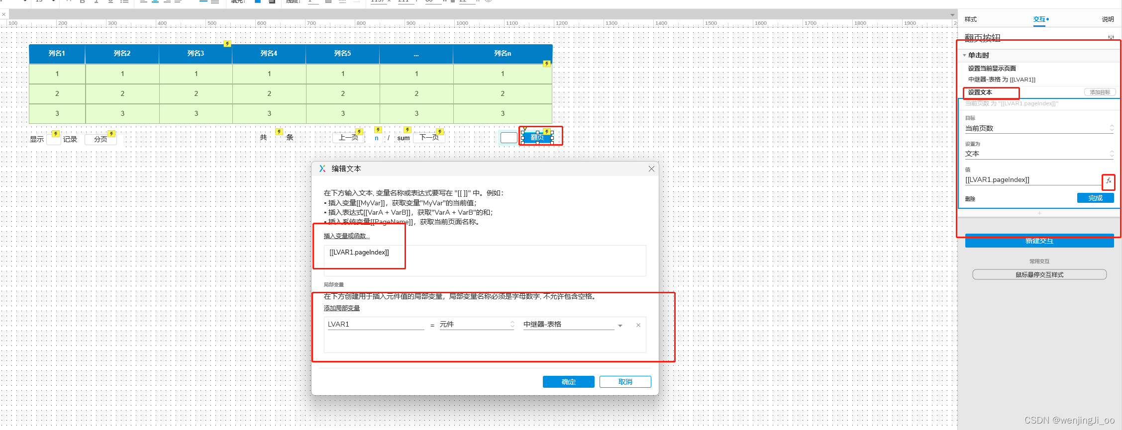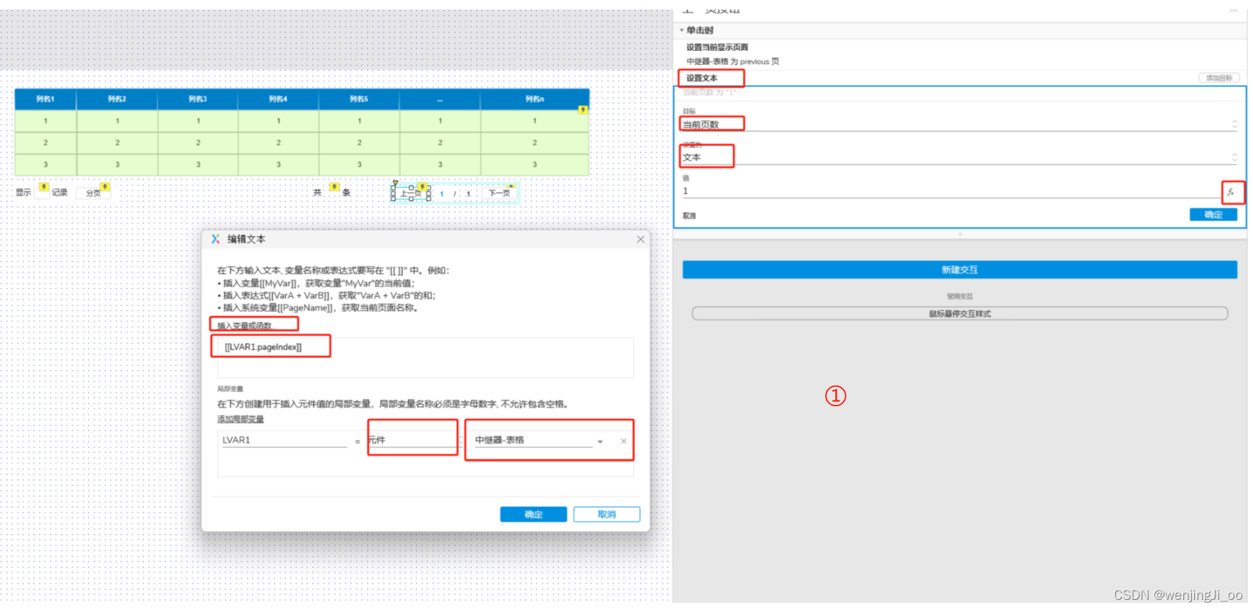 ②追加交互-设置文本-选择当前页数的值-点击否f(x)-选择插入变量选择中继器的页码标签-添加局部变量-选择元件为中继器表格-完成;