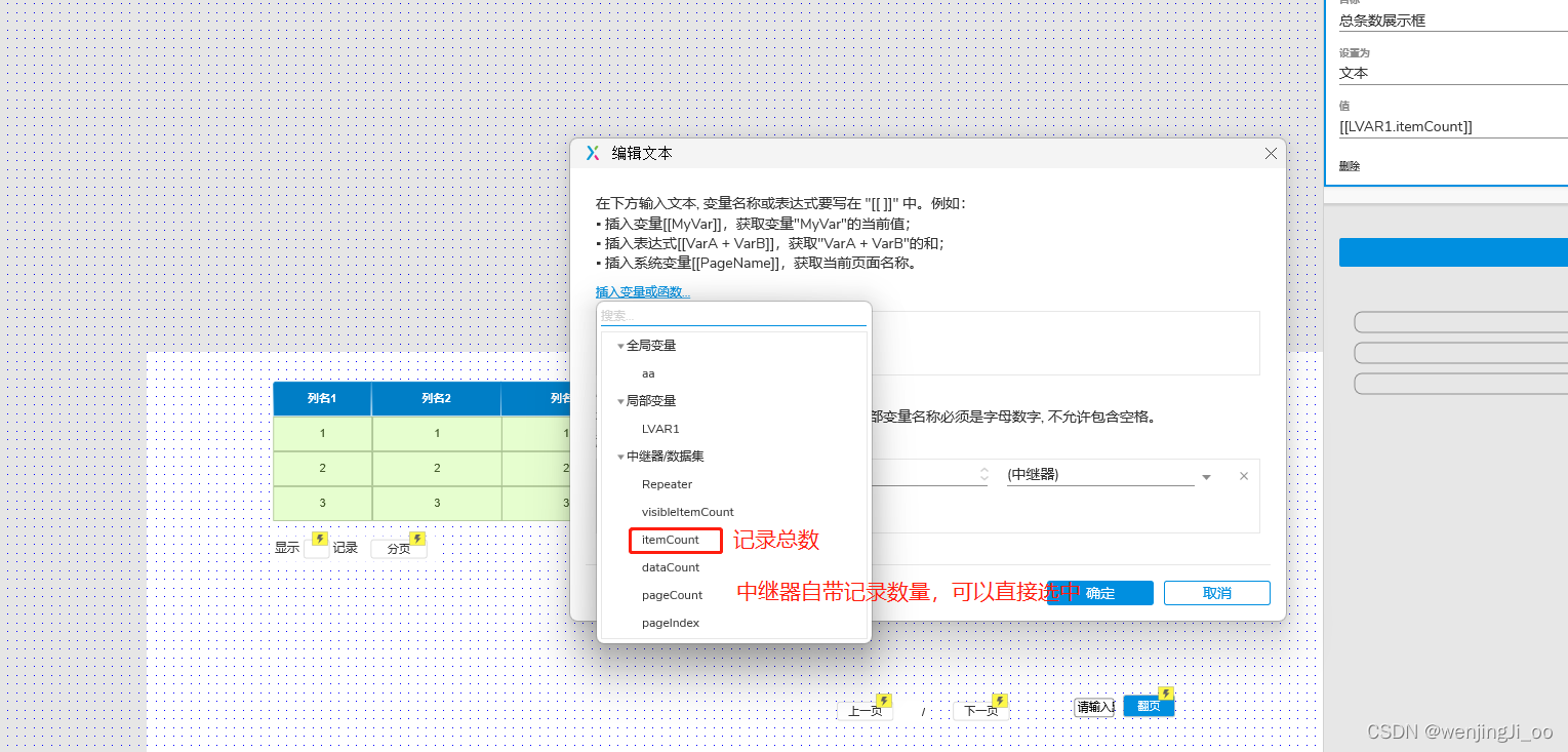 ③选中总页数矩形-点击新建交互-选择加载时-设置文本-选择需要设置文本的元件-点击f(x)-选择pagecount-添加局部变量-选择元件-选择中继器表格-完成操作