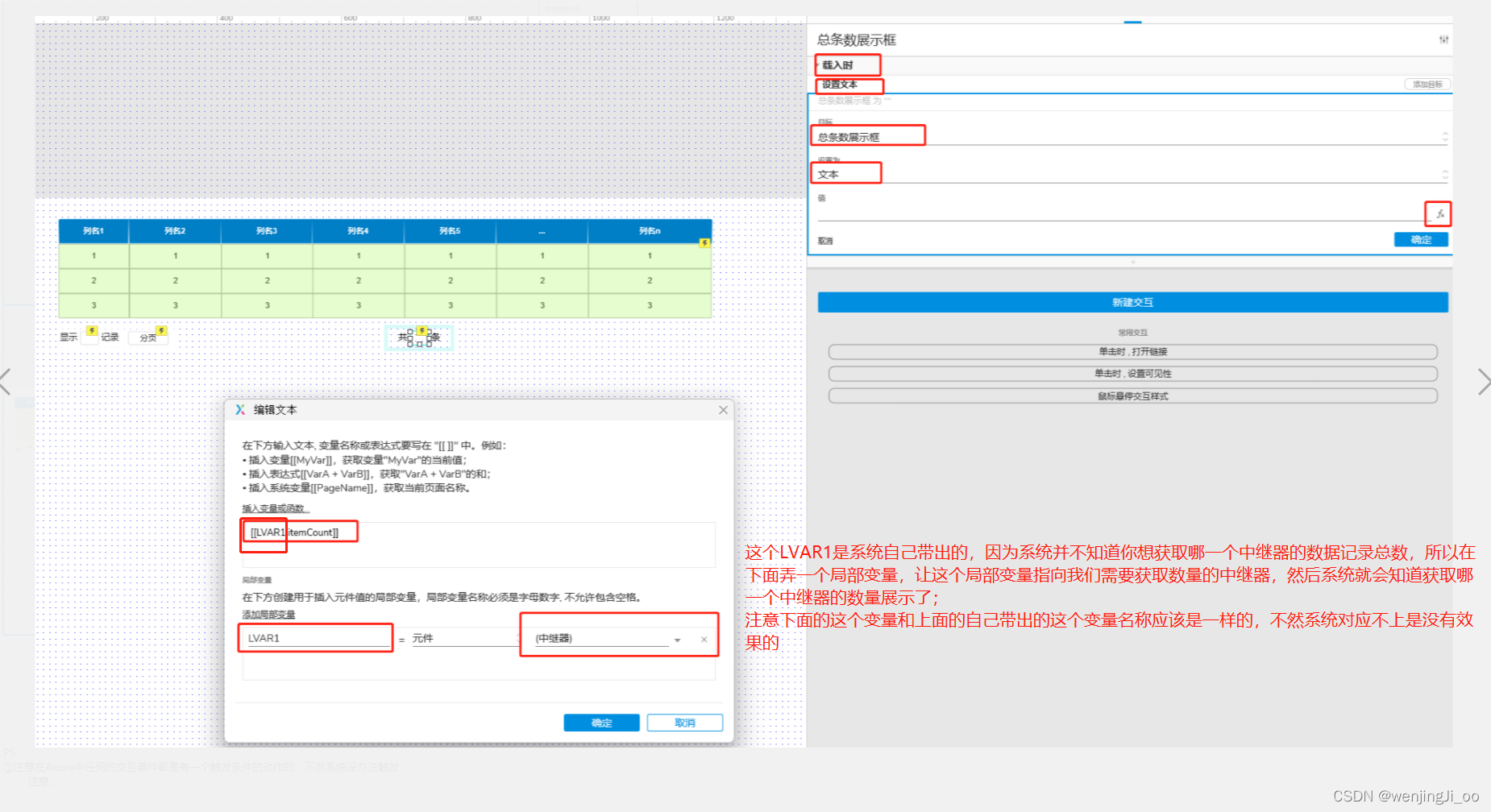 操作步骤:选中“总条数展示框”-点击新建交互-选择载入时-设置文本-选择需要设置文本的元件“总条数展示框”-点击f(x)-选择中继器下面的itemcount-选中itemcount需要设置哪一个中继器的itemcount,所以在下面添加一个变量值,变量值指向中继器,点击确定就完成了;