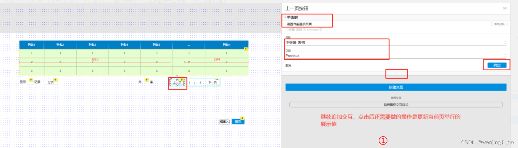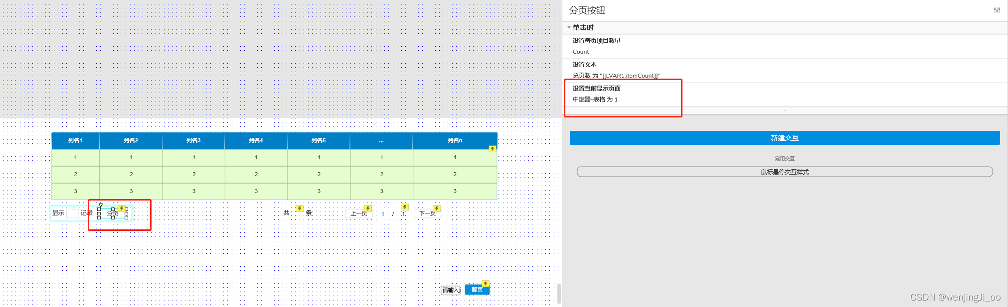 ①点击按钮时(触发事件),给表格翻页(动作),翻页之后的当前页面数字更新为当前为中继器表格的第N页;