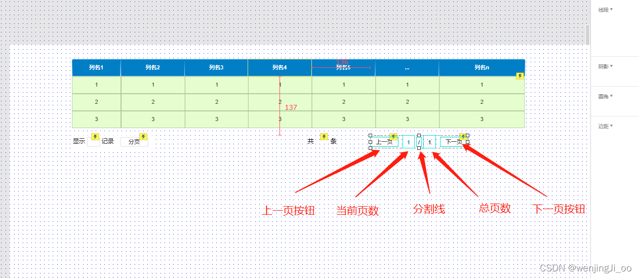 1.把页面元素拉出来放好,然后命名 ①矩形:展示显示 记录,命名为 矩形1; ②输入框:给用户提供输入每页的数量的地方,命名为 页面数量输入框; ③按钮:点击之后分页生效,命名为 分页按钮;