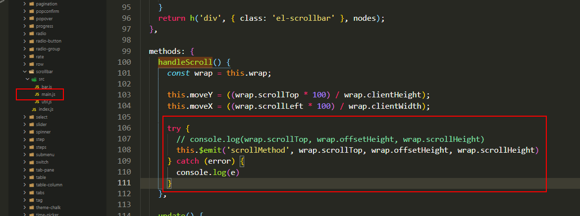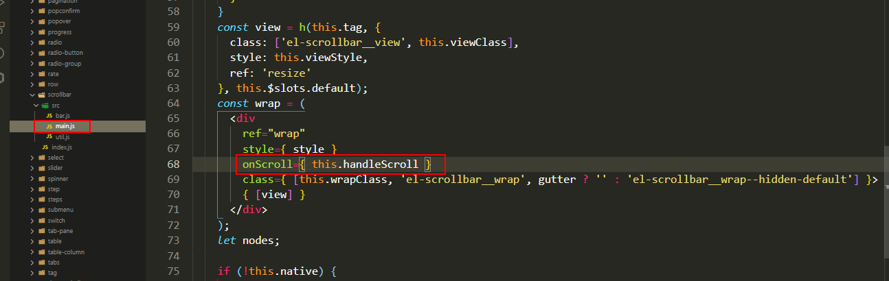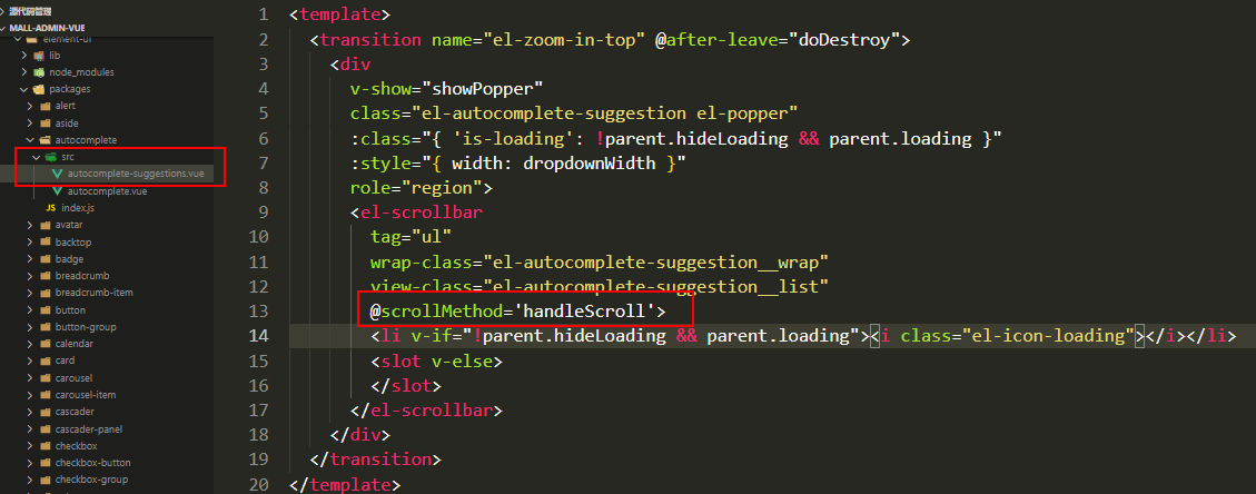 1、由于element 中的是用 el-scrollbar 实现下拉滚动,找到el-scrollbar中监听滚动的事件。