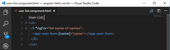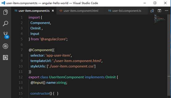 上图右侧的hello-world.component.ts文件中,import引入两个依赖Component和OnInit;@Component部分便是装饰器了,这部分代码将HelloWorld类装饰成了一个组件。因为selector属性的值为“app-hello-world”,