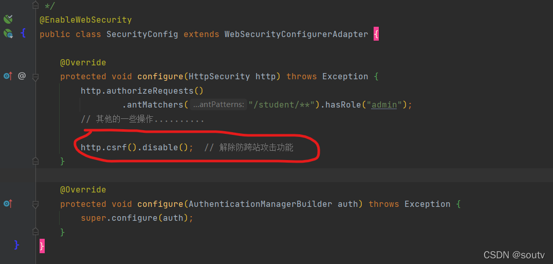 解决方法:在授权的方法里解除Spring Security默认开启的防跨站攻击功能(有利有弊,自己抉择),加上红色括号里的代码就可以了。