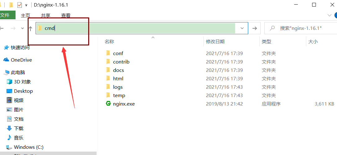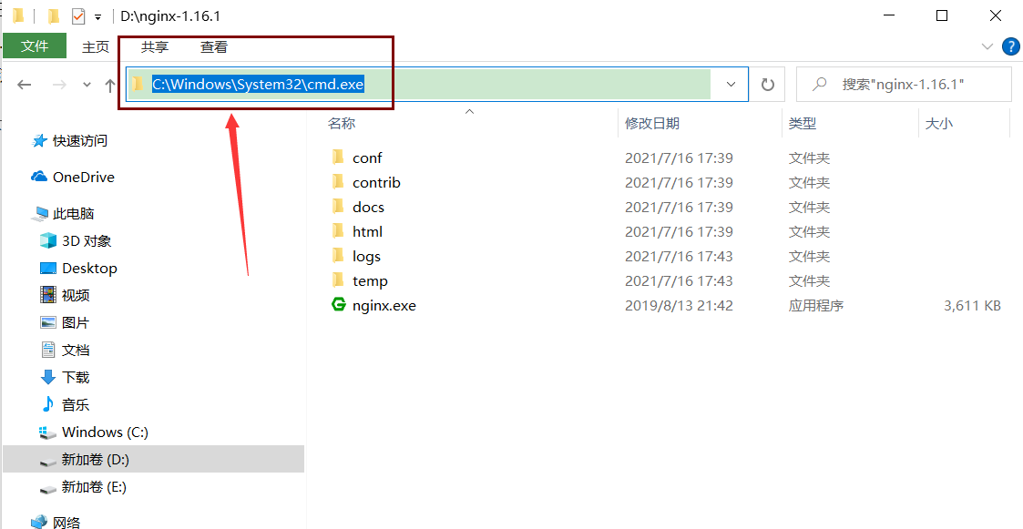(注意:在下载完nginx文件之后,也可以找到文件所在位置,直接cmd进入)