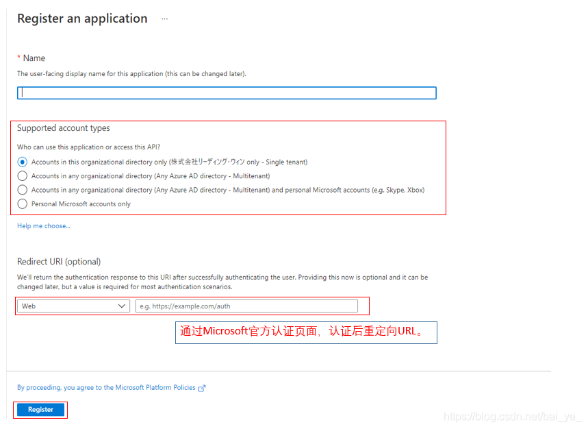 5.输入app的名称,以及选择谁可以访问这个API,之后是认证后的重定向URL(如果需要的话),关于这个url会在第二部分用户认证的时候补充说明。