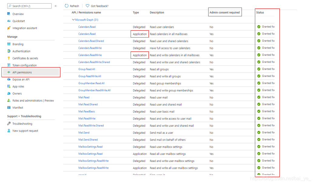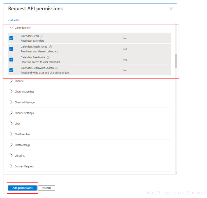 此处是开发的时候,为了测试各种情况,所以追加了很多许可,如果只是读取OutLook日历事件的话,只需要User的Read和Calendars的Read和Write。