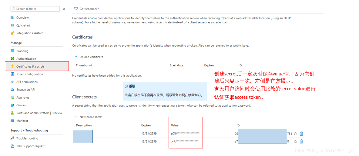 此处的Client Secrets是无用户认证的时候需要的,需要注意的是secret value只会在创建的时候显示一次,再次显示的时候将无法显示。