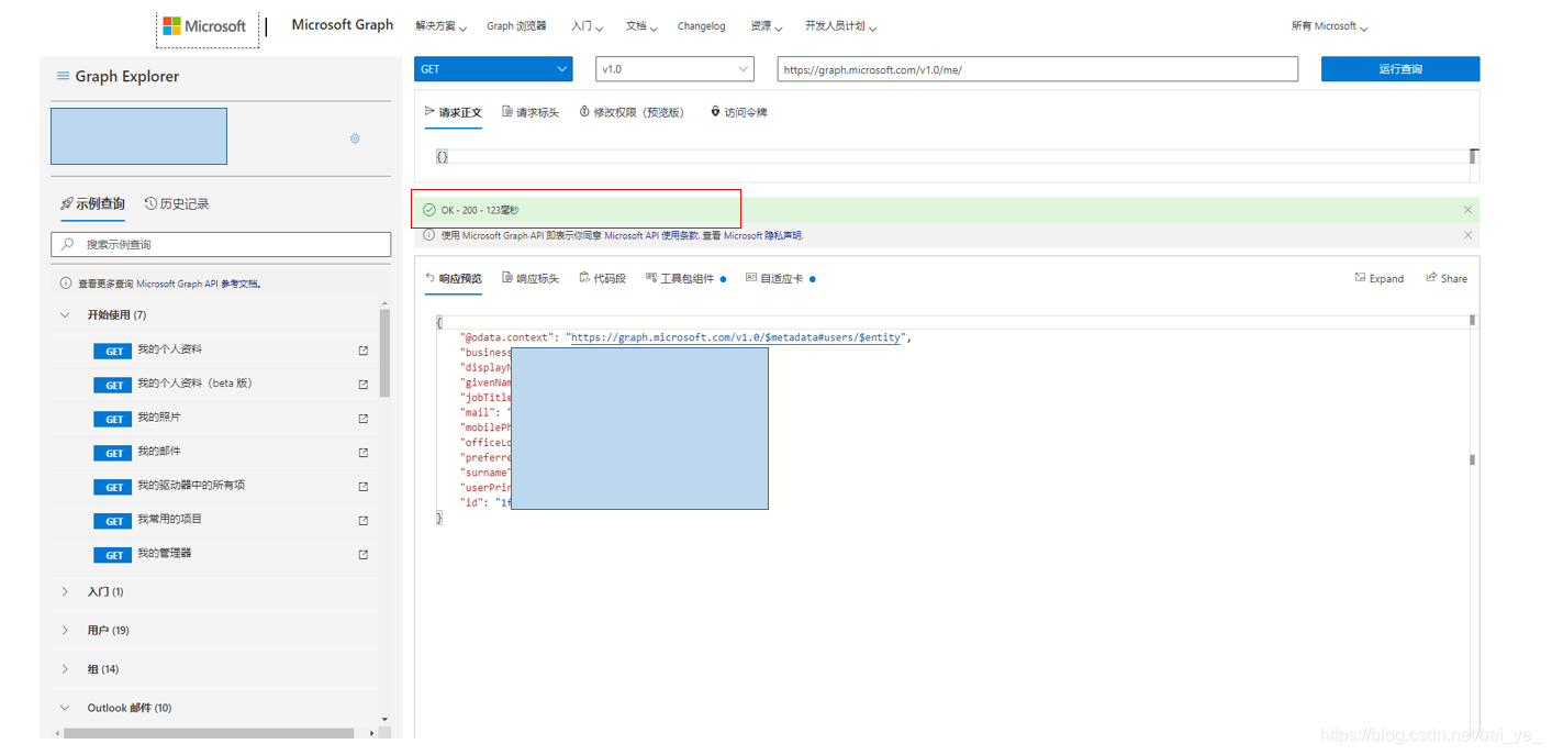 完成注册之后可以借助Graph 浏览器来简单测试,这里比较方便的一点是会自动提示该接口需要什么样的权限,如果缺少的话,可以及时去API permission里面追加。