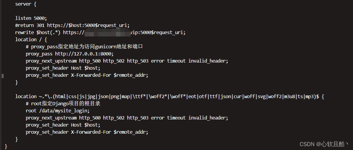 server {listen 5000;location / {# proxy_pass指定地址为访问gunicorn地址和端口proxy_pass http://127.0.0.1:8000;proxy_next_upstream http_500 http_502 http_503 error timeout invalid_header;proxy_set_header Host $host;proxy_set_header X-Forwarded-For $remote_addr;}location ~.*.(html|css|js|jpg|json|png|map|ttf*|woff2*|woff*|eot|otf|ttf|json|cur|woff|svg|woff2|m3u8|ts|mp3)$ {# root指定Django项目的根目录root /data/mysite_login;proxy_next_upstream http_500 http_502 http_503 error timeout invalid_header;proxy_set_header Host $host;proxy_set_header X-Forwarded-For $remote_addr;}