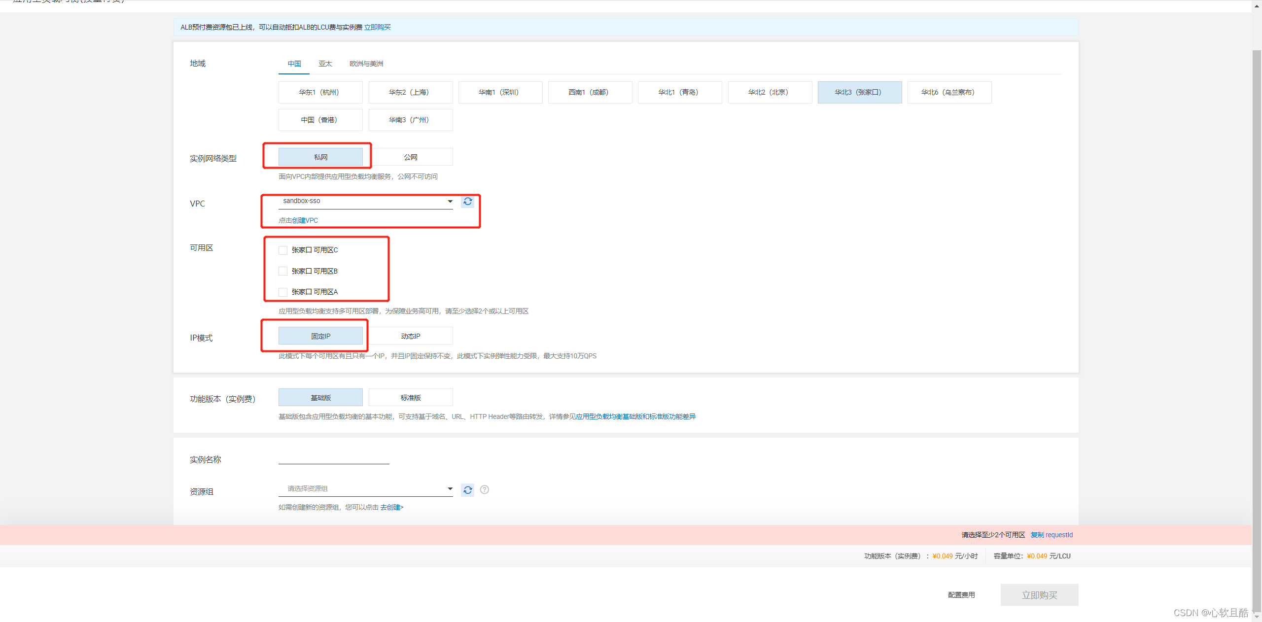 实例网络类型选私网,vpc与可用区选择实例具体使用的vpc以及可用区,IP模式一般选择使用固定IP,其他选项自由定义: