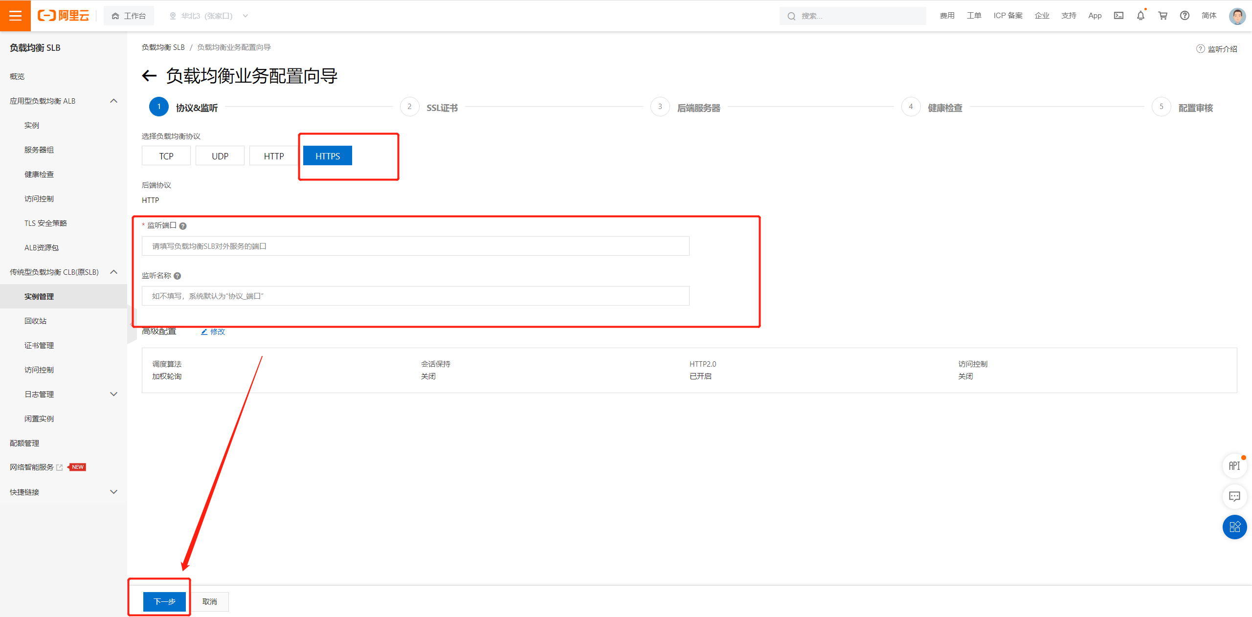 传统型CLB服务里创建或找到已有域名的服务,监听配置向导,根据实际情况选择,我这里选择HTTPS: