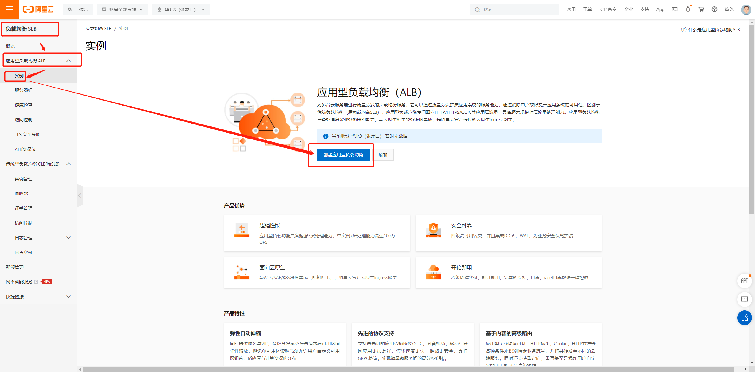 找到阿里云SLB服务点击创建ALB实例: