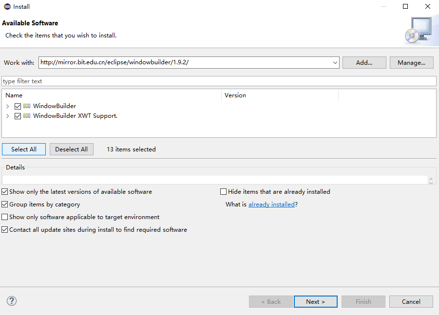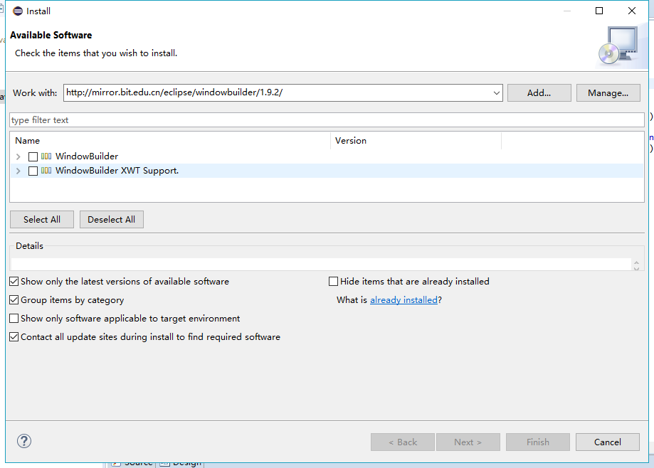 如果你所有的版本都下载了一边,可以直接试下 WindowBuilder 1.9.2 版本国内的源 ,如下所示。如果不是请往下看完整教程。