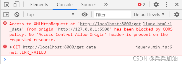 在HTML页面下右键Open in Live Server 后会出现如下(F12 控制台),即跨域的问题,这里是由于使用的 Live Server 它创建了一个新的域(http://127.0.0.1:5500, 端口号5500),而我们需要的端口号为8000(且我的笔记本的localhost不为127.0.0.1),我这里是域名和端口号都不一致(不同源)而导致跨域问题的出现。 (域名,协议,端口号只要一个不一致就会造成不同源)