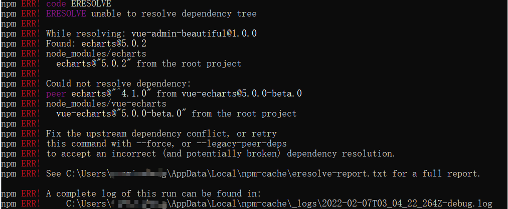 上面的错误是无法解决依赖问题,解决办法是升级或者降级自己的node版本,然后重新安装依赖包;还有种方法是使用下面的命令,不用改node版本,就可以npm i