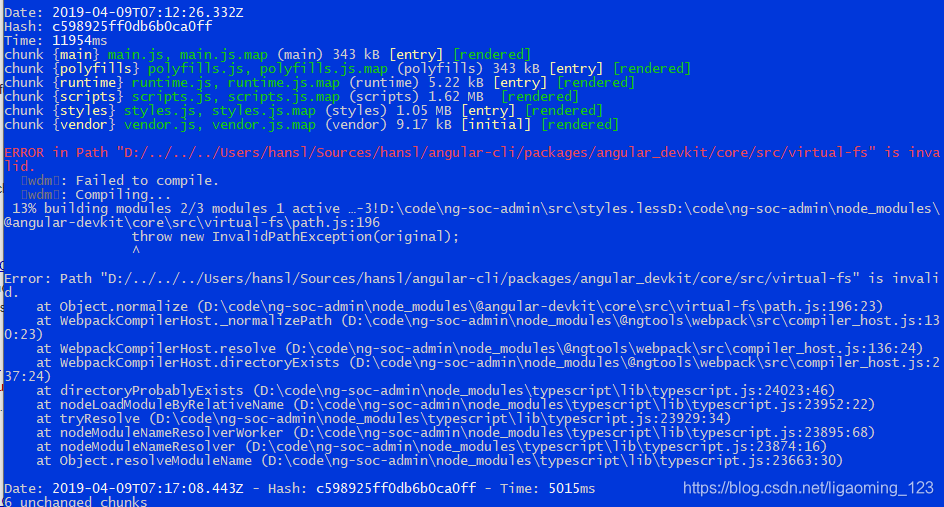 错误信息:ERROR in Path "D:/../../../Users/hansl/Sources/hansl/angular-cli/packages/angular_devkit/core/src/virtual-fs" is invalid.
